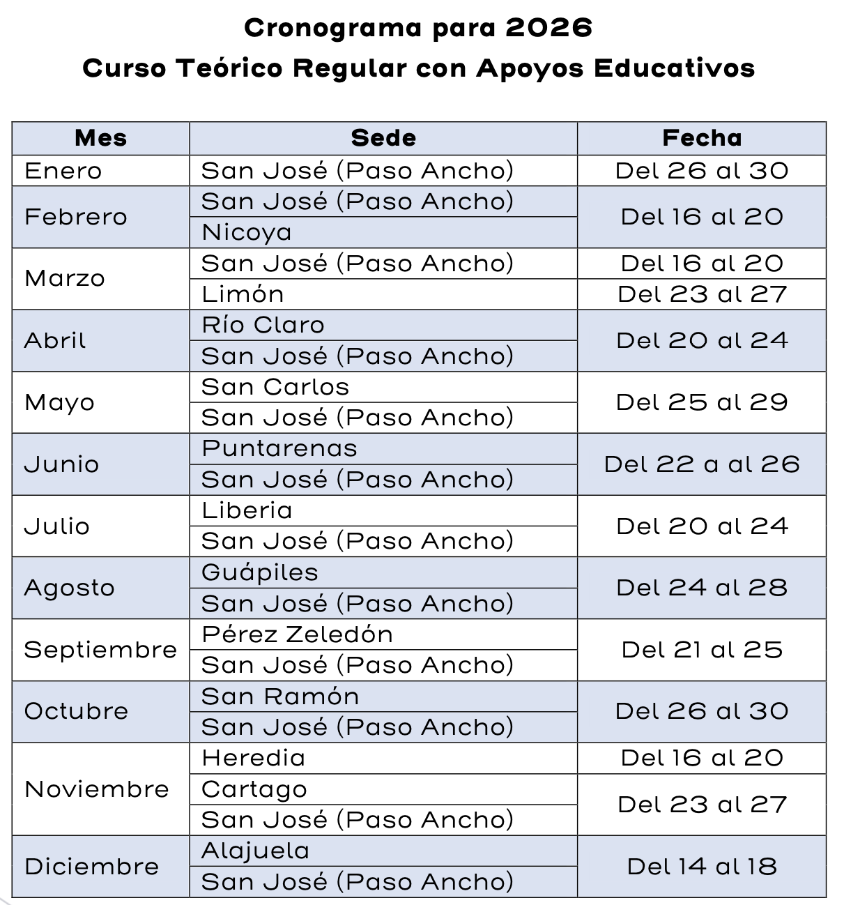 La programación de este curso denominado Curso Teórico Regular con Apoyos Educativos (antes conocido como iletrados), incluye la aplicación del mismo, al menos una vez en cada sede regional de Educación Vial, así como cada mes en la sede central ubicada en Paso Ancho San José (ver cronograma).