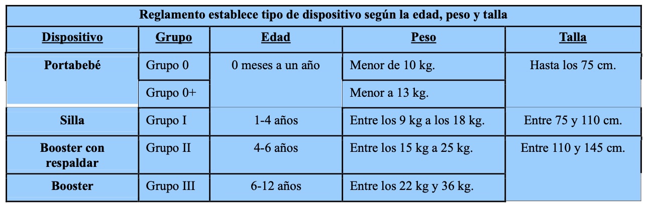 Portabebé, silla, buster ,con o sin respaldar, son los cuatro dispositivos de retención infantil aprobados, vía decreto, para trasladar niños en un vehículo, cada uno según edad, talla y peso, como referencias.