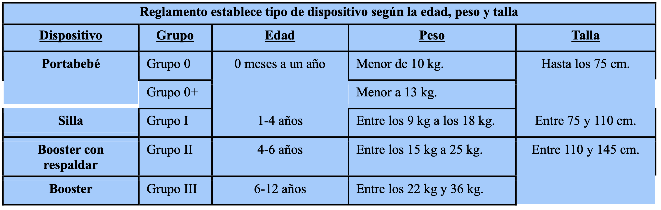 Retomando el tema inicial, Sánchez recalcó que el portabebé, la silla, el buster, con o sin respaldar, son los cuatro dispositivos de retención infantil aprobados, vía decreto, para trasladar niños en un vehículo, cada uno según edad, talla y peso, como referencias.